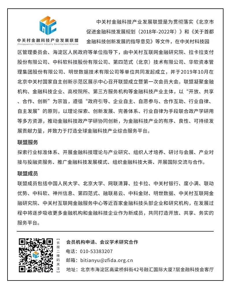 未来,中关村金融科技产业发展联盟将发挥自身使命,保障会员权益,推动金融科技政产学研协同创新,致力于打造金融科技产业综合服务平台,为中关村金融科技行业,为北京金融科技与专业服务创新示范区建设,为北京金融科技产业聚集区发展贡献力量。